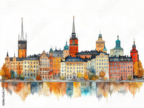 Fototapeta premium Charming Swedish town with colorful buildings and water reflections