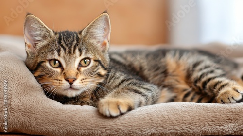 © Nutty, Fototapeta premium Charming Tabby Cat Relaxing Comfortably on Soft Blanket in Cozy Home Setting