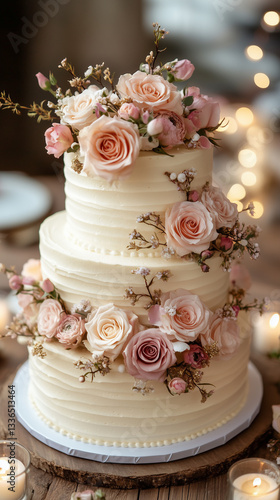 © Yastreba, Fototapeta premium Charming Three-Tier Cream Wedding Cake Adorned with Pink Roses and Floral Details