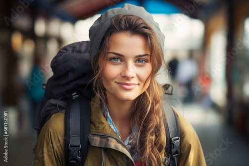 © Tetiana, Fototapeta premium Charming tourist walking in city streets weekend vacation generative ai concept