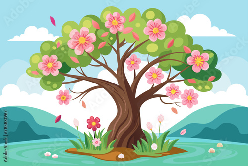Fototapeta premium Charming trees with colorful flowers bloom beautifully against a crisp white...