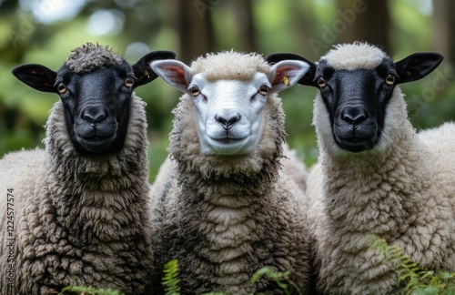 Fototapeta premium Charming Trio of Sheep with Unique Wool Patterns in Lush Green Environment...