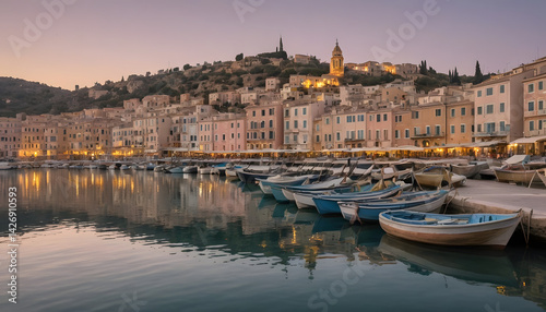 Obraz premium Charming Twilight View of Coastal Town With Boats in the Harbor