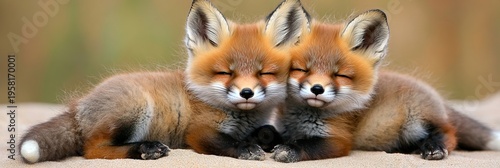Fototapeta premium Charming twin red fox kits playing on a peaceful sandy dune, showcasing...