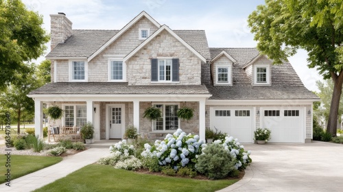 © Shahadat Graphics, Obraz premium Charming Two-Story House with Stone Facade and Landscaped Yard