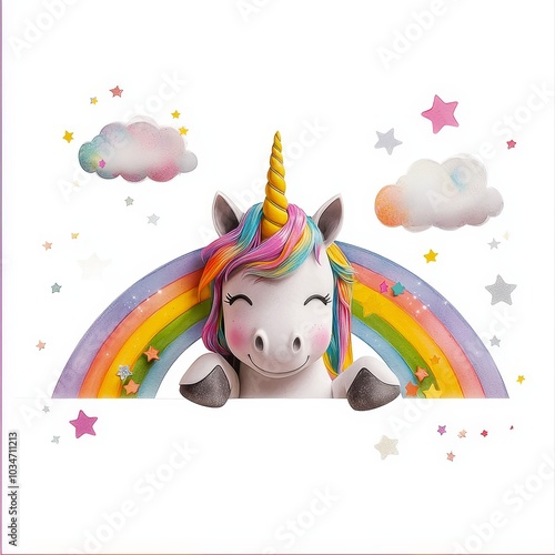 © NATTAKORN, Naklejka premium Charming Unicorn Peeking Out From Behind a Colorful Rainbow