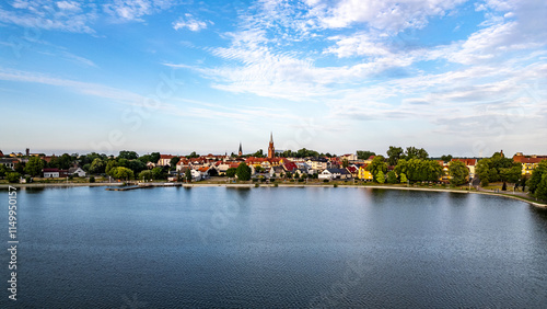 Naklejka premium Charming View of Lake Raduń in Wałcz, Poland. A picturesque view of Lake Raduń with colorful houses, lush greenery, and serene waters, reflecting the peaceful town
