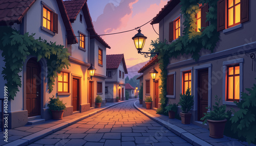 Obraz premium Charming Village Street at Dusk with Warm Illuminated Windows