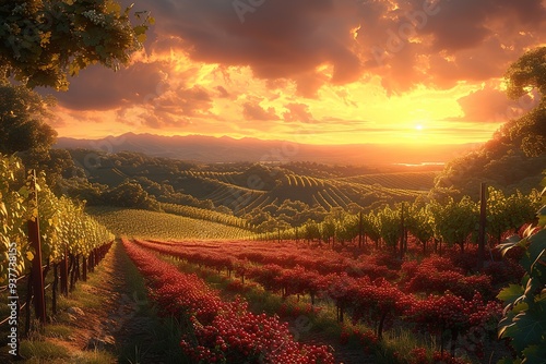 © create, Naklejka premium Charming Vineyard at Sunset - A charming vineyard bathed in the warm glow of sunset Digital Illustration Part#100623