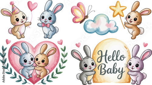 © Ayan, Naklejka premium Charming Watercolor Baby Bunnies and Decorative Elements for Nursery Art and Invitations Design