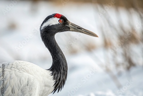 © Danicha, Obraz premium Charming Watercolor Black-necked Crane Illustration on a White Background, Cute Animal Hand-Painted Postcard Perfect for Nature Lovers and Wildlife Enthusiasts