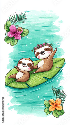 © INT888, Obraz premium Charming watercolor illustration features two adorable sloths relaxing on large green leaf, surrounded by vibrant tropical flowers