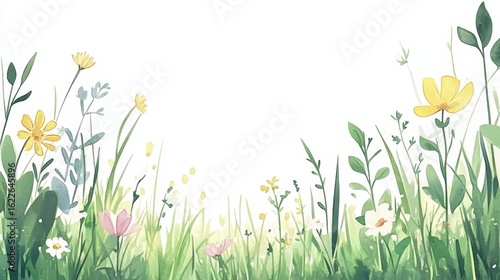 © Ilja, Fototapeta premium Charming Watercolor Meadow Ambience with Light Flowers and Leaf Frames for Romantic Illustrations