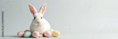 Fototapeta premium Charming White Bunny with Pastel Eggs for Minimalist Easter Designs