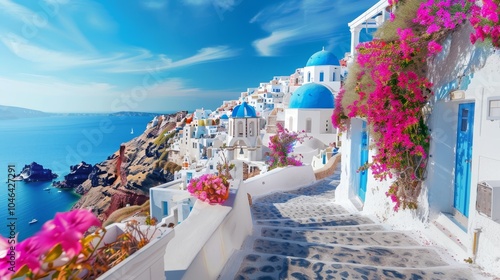 Fototapeta premium Charming white cycladic houses with blue accents surrounded by bougainvillea...