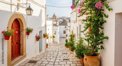 Fototapeta premium Charming White Street: Capture the picturesque beauty of a quaint white street adorned with vibrant flowers and historic architecture, bathed in soft daylight.