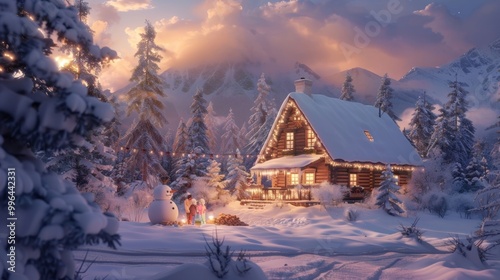 © Ludmila, Naklejka premium Charming winter cabin with snow, cozy lights, and a warm fire near a snowy landscape at sunset, perfect for holiday spirit.