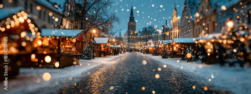 © thodonal, Fototapeta premium Charming winter market scene with lights and snowfall in evening