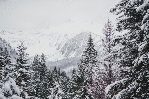 © Irina84, Fototapeta premium Charming winter mountain landscape. Beautifully snow-covered high peaks over hills. Near Zakopane.
