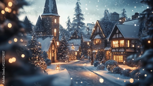 Naklejka premium Charming winter village, cozy cottages surrounded by snow, softly glowing lights, peaceful atmosphere, perfect for festive themes.