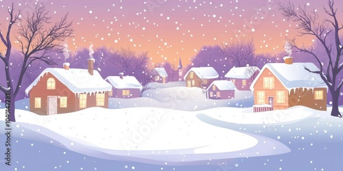© Kamonwan, Fototapeta premium Charming winter village under soft snowfall at dusk.