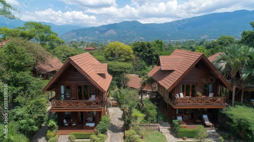 © Puttipong, Obraz premium Charming Wooden Cabins Surrounded by Nature