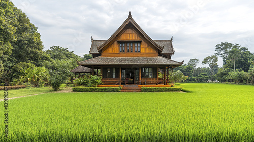 © Thanthara, Obraz premium charming wooden Thai village house with steep roof stands amid lush greenery