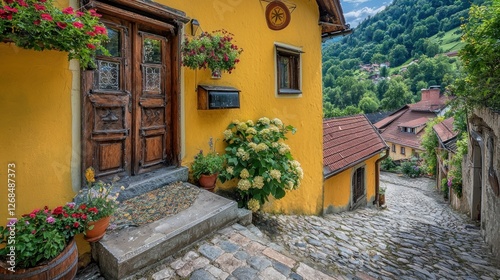 © affan, Fototapeta premium Charming yellow house, cobblestone alley, mountain village, lush greenery