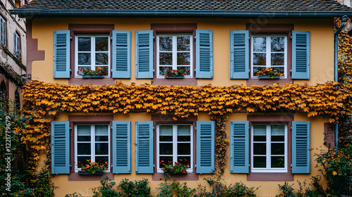 Naklejka premium Charming Yellow House with Blue Shutters and Fall Foliage Accents
