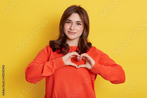 © sementsova321, Fototapeta premium Charming young girl showing heart gesture, smiles happily, has romantic feelings, seeks lonely hearts, feels passion, dresses in casual orange sweater, posing isolated over yellow background.