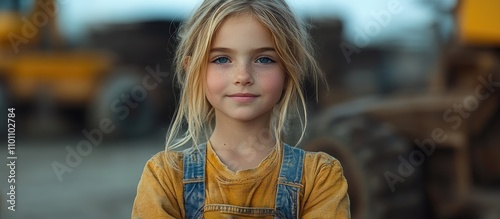 Fototapeta premium Charming young girl wearing overalls stands confidently in a construction setting with heavy machinery in the background.
