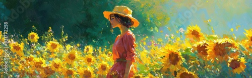 Fototapeta premium Charming young lady in a vibrant sunflower garden