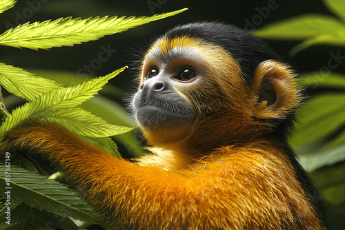 © Starkreal, Fototapeta premium Charming Young Monkey Curiously Observing Green Leaves in a Tropical Forest Environment