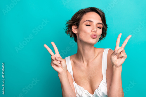 © deagreez, Fototapeta premium Charming young woman in casual top making a playful peace sign gesture against a vibrant teal background, exuding charm and positivity.