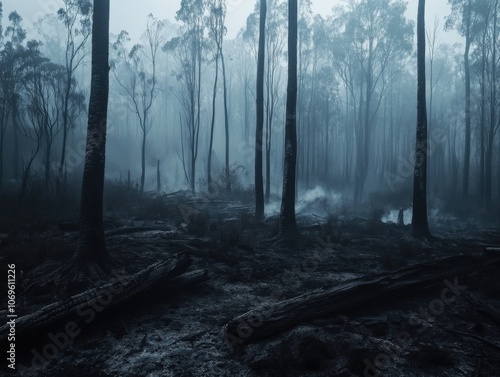 Naklejka premium Charred Forest After Fire, Smoky Haze