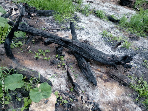 Obraz premium charred tree trunk and ashes of an extinct fire