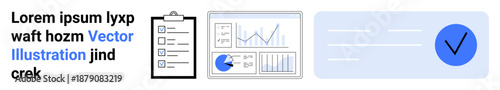 Obraz premium Chart displays, checklist clipboard, and confirmation icon emphasize analytics, planning, and decision-making. Ideal for reporting, project tracking, data management, workflow organization