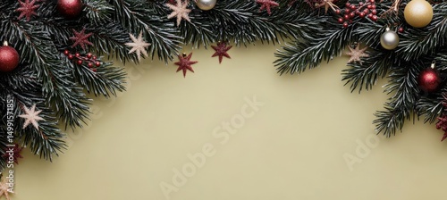 © Ilja, Fototapeta premium Chartreuse Christmas Banner with Ruby Red Star, Frosted Ornaments, and Lush Evergreen Fir Sprigs