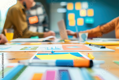 © Surachetsh, Fototapeta premium Charts and reports lie on a well-lit office table, indicating business analytics, while a blurred backdrop captures workplace conversations and tasks.
