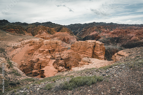 © Mathias, Fototapeta premium Charyn Grand Canyon with clouds and sun red orange stone Martian landscape