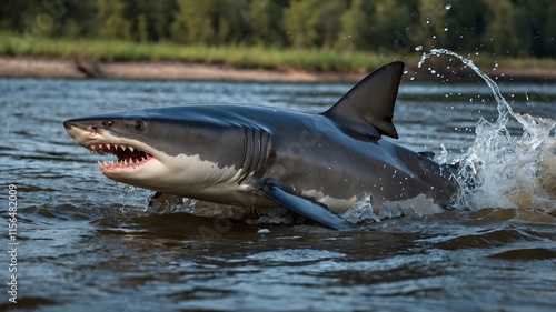 © KeeriwalaGamage, Fototapeta premium Chasing Prey: Northern River Shark in a Fierce Hunt Through Shallow Waters