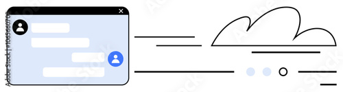 Fototapeta premium Chat window interface with user icons and text bubbles, accompanied by a cloud icon and lines suggesting movement. Ideal for communication apps, cloud storage, data synchronization, teamwork, remote