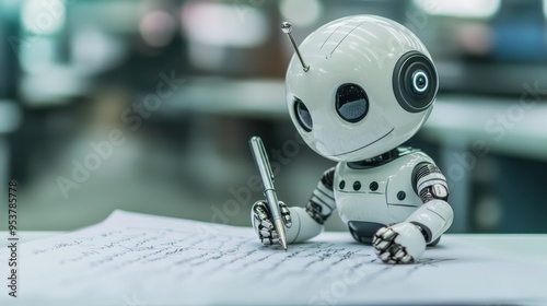 © 69 Timeless Studio , Fototapeta premium ChatGPT bot depicted writing answers with a pen on paper, merging AI and traditional writing. Clean background with copy text space.