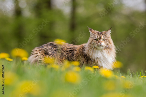 © shocky, Fototapeta premium Chatte maine coon en extérieur dans les fleurs de pissenlit