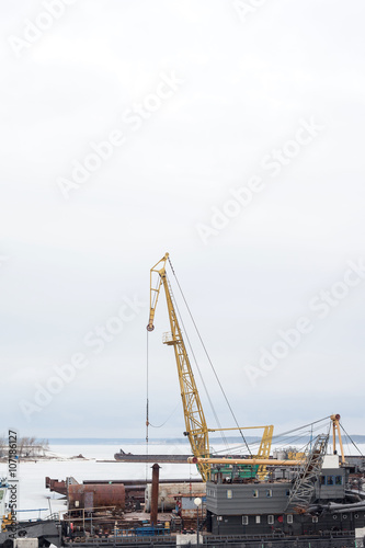 Fototapeta premium Cheboksary, Russia - April 2, 2016: floating crane in the river port in winter