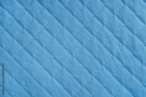 Fototapeta premium Checkered, diamond stitching pattern, blue quilted fabric background. Blanket or puffer jacket, stitch rhombus texture close up, macro. Wallpaper, backdrop.