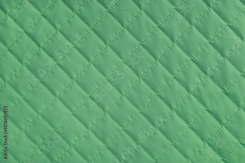 Fototapeta premium Checkered, diamond stitching pattern, green quilted fabric background. Blanket or puffer jacket, stitch rhombus texture close up, macro. Wallpaper, backdrop.