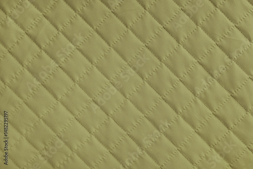 Fototapeta premium Checkered, diamond stitching pattern, khaki quilted fabric background. Blanket or puffer jacket, stitch rhombus texture close up, macro. Wallpaper, backdrop.