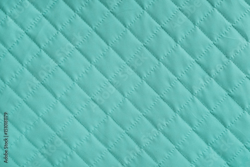 Fototapeta premium Checkered, diamond stitching pattern, turquoise quilted fabric background. Blanket or puffer jacket, stitch rhombus texture close up, macro. Wallpaper, backdrop.