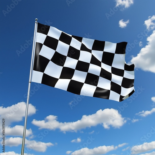 © Poj, Obraz premium Checkered racing flag waving on a metal pole against a blue sky